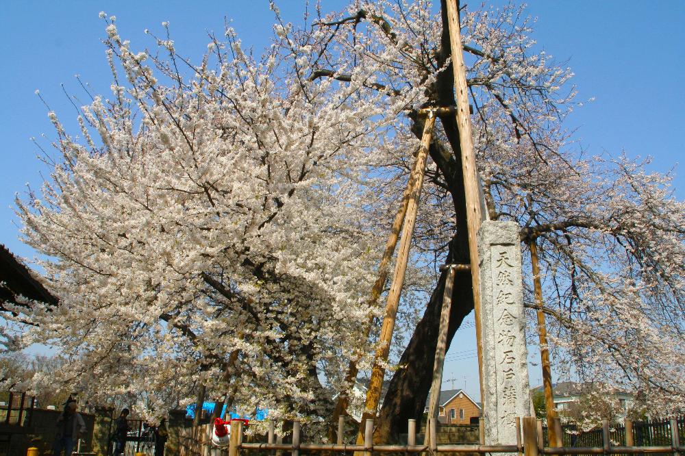 枝が柔らかくしなっていることから枝垂桜と呼ばれ、老齢の木は枝が折れてしまわないように支柱を据えています。